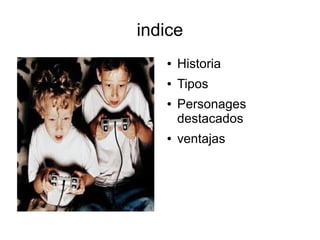 El documento describe brevemente la historia y evolución de los videojuegos desde sus orígenes en la década de 1940 hasta la actualidad dominada por una gran industria. También menciona algunos de los tipos de videojuegos más comunes como los de guerra, plataformas, rol y carreras, así como personajes icónicos como Mario y Sonic. Por último, resalta algunas ventajas de los videojuegos como la distracción que proporcionan y su potencial educativo.