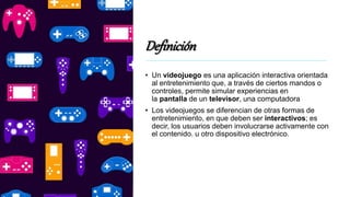 Este documento describe la historia y evolución de los videojuegos. Comienza definiendo un videojuego y sus características principales como la simulación, interactividad y entretenimiento. Luego resume la evolución de las consolas desde la primera Magnavox Odyssey creada por Ralph Baer en 1972 hasta las consolas modernas con mayor interacción del usuario. Finalmente, proporciona información biográfica sobre Ralph Baer, reconocido como el "Padre de los Videojuegos".