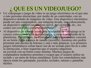 Un videojuego es un juego electrónico en el que los jugadores interactúan con imágenes de video a través de dispositivos como computadoras, máquinas arcade, consolas de videojuegos o teléfonos móviles. Los jugadores usan controladores como gamepads, joysticks o pantallas táctiles para controlar personajes u otros elementos en entornos virtuales y alcanzar objetivos según las reglas del juego. Los videojuegos se graban en cartuchos, discos u otros medios y ofrecen diversas formas de interacción a trav
