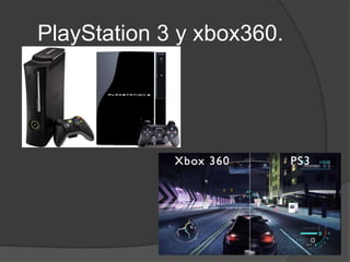 La Xbox 360 es la segunda consola de Microsoft lanzada entre 2005-2006. Permite jugar en línea y descargar contenidos a través de Xbox Live. Compite con la PlayStation 3 de Sony y la Wii de Nintendo. La PS3, lanzada en 2006-2007, tiene varios modelos con diferentes capacidades de almacenamiento y características. Ambas consolas permiten jugar en línea, descargar contenido multimedia y tienen capacidades para reproducir Blu-ray.