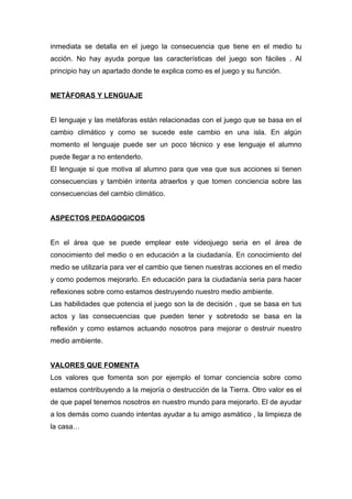Este documento describe un videojuego llamado Honoloko que tiene como objetivo crear conciencia sobre la conservación del medio ambiente. El jugador asume el rol de un estudiante que debe responder preguntas cuya respuesta afecta positiva o negativamente el medio ambiente de una isla. El juego está destinado a estudiantes de primaria de 5o o 6o grado y fomenta valores como la toma de conciencia sobre cómo nuestras acciones pueden mejorar o destruir el planeta.