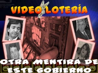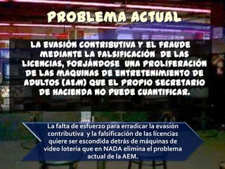 El documento examina el impacto negativo de la video lotería como un nuevo invento gubernamental, destacando la evasión contributiva y el aumento de la adicción al juego. Se prevé que la proliferación de máquinas de entretenimiento de adultos afectará tanto la economía como la salud social en Puerto Rico, con pérdidas significativas en ingresos e incremento de problemas sociales como la violencia y la depresión. Además, se comparan las máquinas de video lotería con sustancias psicoactivas, afirmando que sus efectos adictivos son alarmantes.
