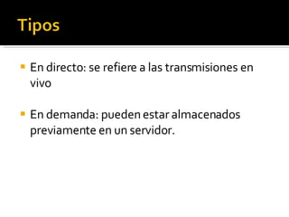 El documento habla sobre el servicio de streaming de video que permite transmitir contenido multimedia a través de Internet sin necesidad de descargarlo, pudiendo ser en vivo o previamente almacenado. Menciona algunos sitios de streaming como YouTube y describe brevemente su tecnología subyacente, registro de usuarios y uso para entretenimiento y educación.