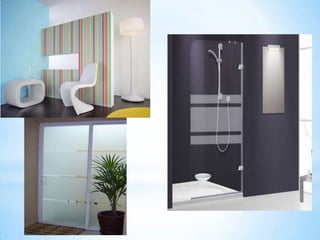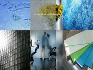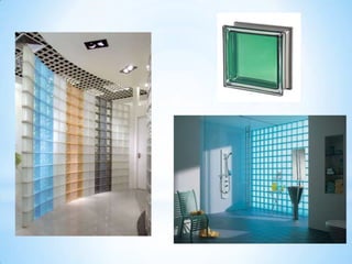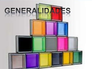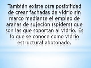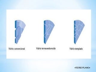 El documento habla sobre los diferentes tipos de vidrio, incluyendo vidrio plano, monolítico, decorado, tratado, estructural, de seguridad, aislante, de control solar y curvo. Describe las características y usos de cada tipo de vidrio.