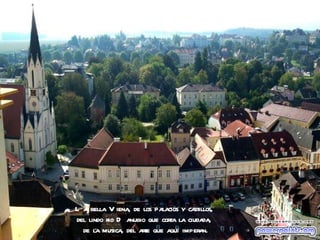 El documento presenta una introducción a Viena, Austria, destacando sus palacios, castillos, música y arte. Describe a Viena como una ciudad de enamorados conocida por sus flores y villas encantadoras, y como la inspiración de grandes compositores y valses vieneses. También menciona algunos de los principales puntos de interés de la ciudad como el Palacio de Schönbrunn, el Teatro Municipal y el río Danubio.