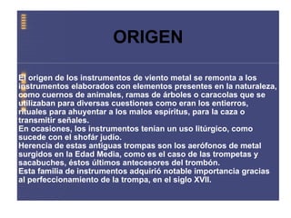 Este documento describe los orígenes e historia de los principales instrumentos de viento metal de la orquesta sinfónica, incluyendo la trompa, la trompeta, el trombón y la tuba. Explica cómo estos instrumentos evolucionaron a partir de cuernos y caracolas naturales y su papel en la orquesta, donde se colocan detrás de los instrumentos de viento madera debido a su sonido más potente. También resume brevemente la historia y características de cada instrumento.