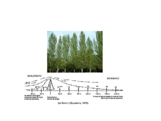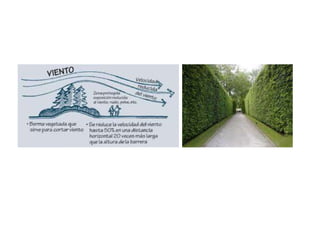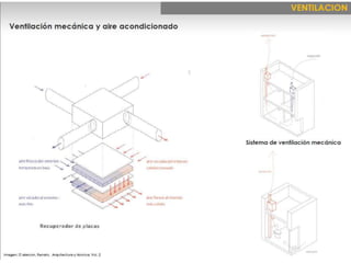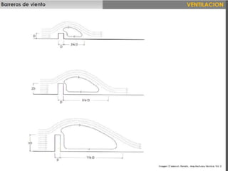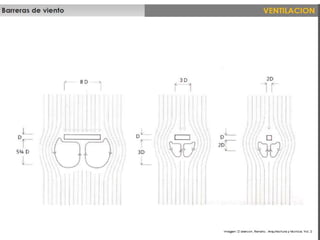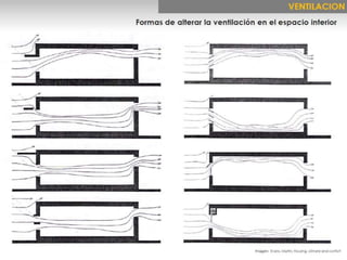 El documento describe cómo los vientos afectan la ventilación de los edificios. Explica que la orientación, forma y disposición de los edificios pueden mejorar o empeorar la ventilación al modificar los campos de presión creados por el viento. También analiza cómo factores como las aberturas, divisiones interiores y relación entre áreas de entrada y salida influyen en los patrones de flujo del aire dentro de los edificios. El objetivo es aprovechar los vientos para mejorar la ventilación natural.