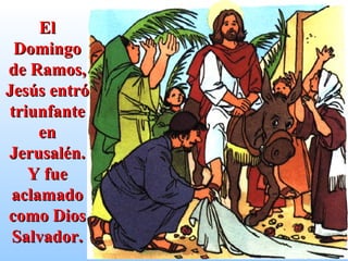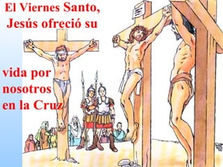 El documento resume los principales eventos de la Semana Santa desde la entrada triunfal de Jesús en Jerusalén el Domingo de Ramos hasta su resurrección, incluyendo la Última Cena, su traición, juicio, crucifixión, muerte, entierro y resurrección, así como mensajes sobre el amor de Jesús y pedir perdón por los pecados.