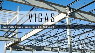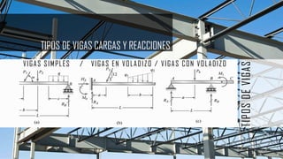 El documento describe los tipos de vigas, sus características y el análisis de cargas y reacciones en vigas simples, en voladizo y con voladizos. Se enfatiza la importancia de determinar las reacciones, fuerzas cortantes y momentos flexionantes para el diseño estructural. Además, se mencionan métodos como el de doble integración y el de trabajo virtual para el cálculo de la rigidez y desplazamientos en estructuras.