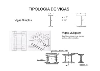 Este documento describe diferentes tipos de vigas de acero utilizadas en la construcción, incluyendo vigas simples, múltiples, reforzadas, void, armadas y de alma llena. También describe disposiciones constructivas como apoyos de vigas, uniones con brochales y empalmes, así como detalles de soportes y uniones viga-pilar.