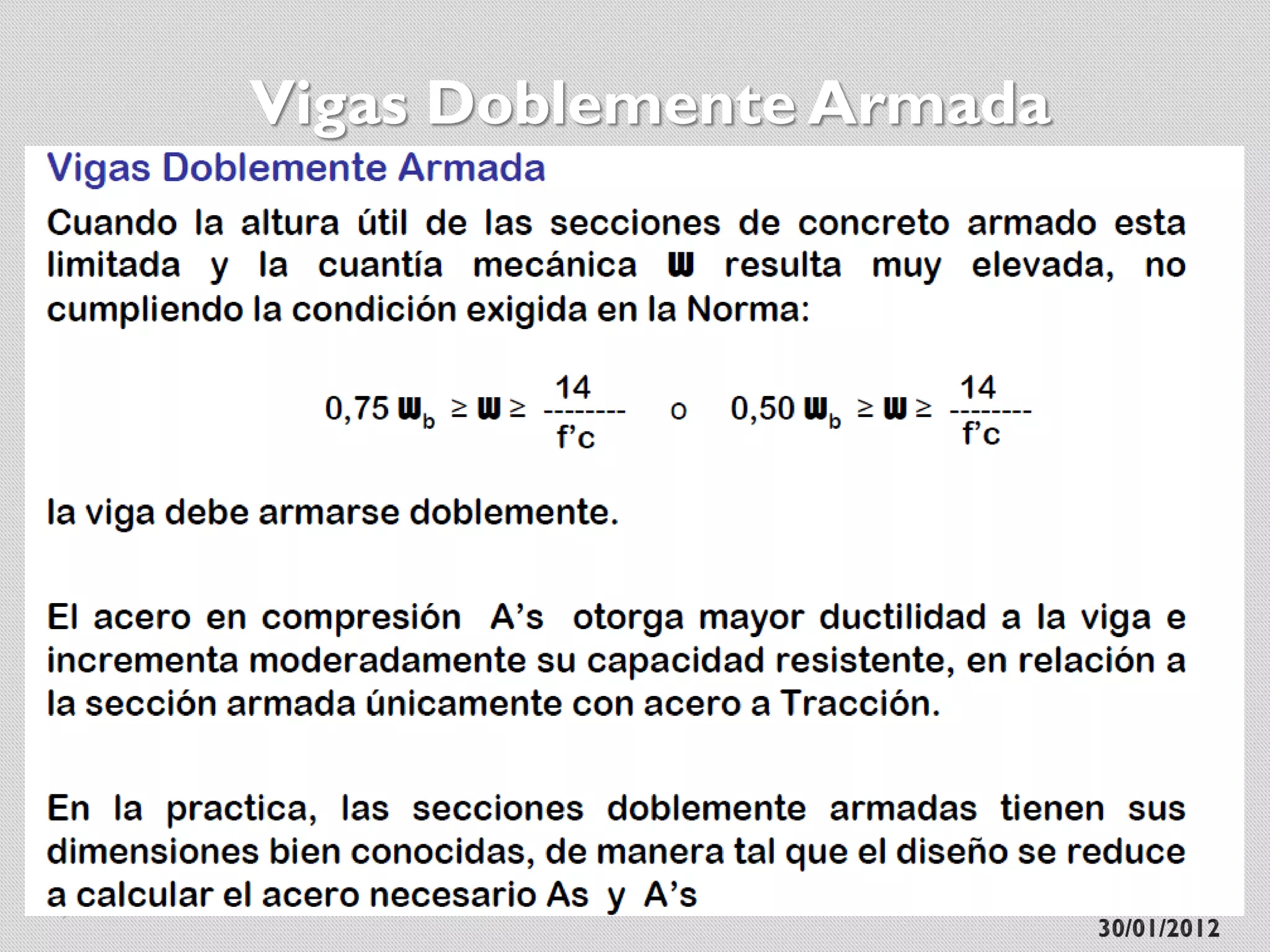 Las vigas doblemente armadas son vigas de concreto reforzado con barras de acero en la parte superior e inferior para resistir esfuerzos de flexión y tracción. Estas vigas tienen una alta resistencia a cargas verticales y momentos flectores. El refuerzo adicional en la parte superior e inferior permite que las vigas doblemente armadas soporten cargas más pesadas que las vigas simplemente armadas.