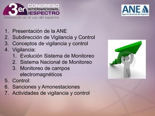 El documento describe las funciones de vigilancia y control del espectro radioeléctrico realizadas por la Agencia Nacional del Espectro. Incluye información sobre el sistema de monitoreo, mediciones de campos electromagnéticos, investigaciones de incumplimientos, y sanciones. El objetivo es garantizar el cumplimiento de la normativa sobre el uso adecuado del espectro radioeléctrico y la protección de la salud.
