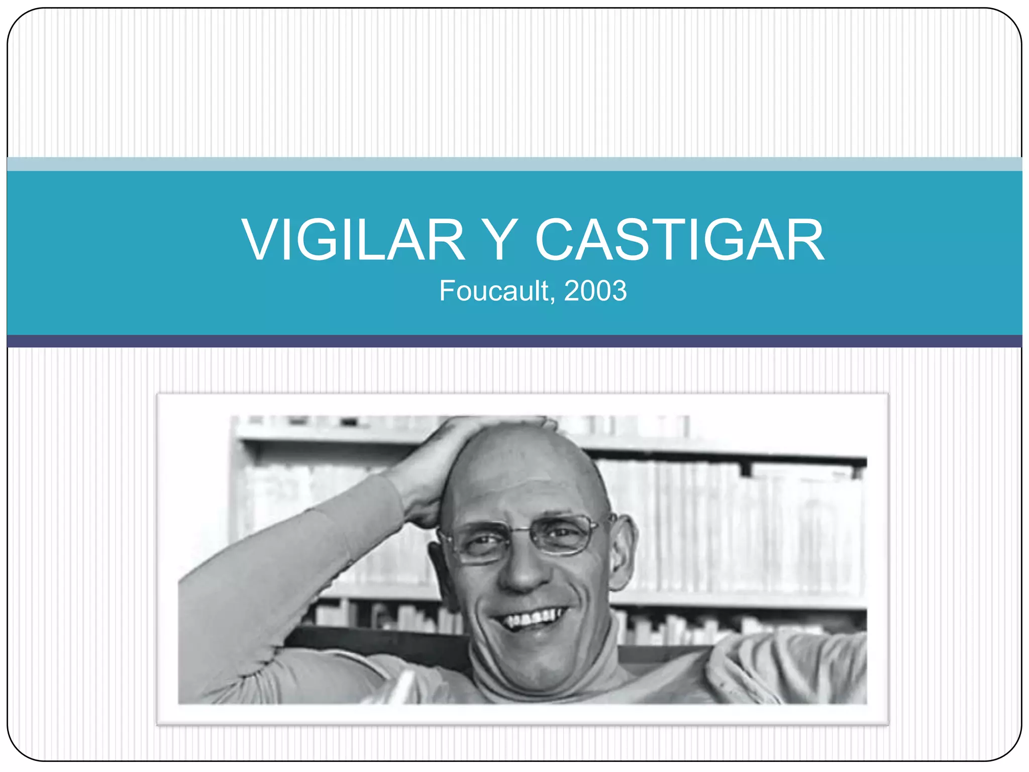 Este documento resume los conceptos clave de Vigilar y Castigar de Foucault sobre el ejercicio del poder y la disciplina. Foucault describe cómo el poder se ejerce a través de la imposición de normas, el castigo y la vigilancia para producir cuerpos dóciles. La disciplina se logra mediante la distribución espacial de los individuos, el control de su actividad y la normalización de su conducta a través de mecanismos como el panóptico y la evaluación constante.