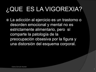 La vigorexia es un trastorno mental caracterizado por una obsesión por aumentar la masa muscular a través del ejercicio excesivo y dietas estrictas. Las personas con vigorexia tienen una distorsión de su imagen corporal y baja autoestima. El tratamiento involucra terapia cognitiva-conductual y nutrición para modificar la percepción corporal y hábitos dañinos. La prevención requiere enseñar a los jóvenes a valorarse a sí mismos y evitar caer en estereotipos de belleza irrealistas.