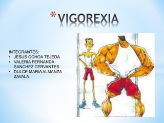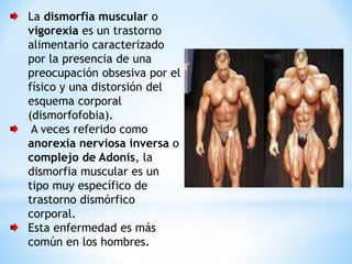 El documento describe la vigorexia o dismorfia muscular, un trastorno alimentario caracterizado por una obsesión por el físico muscular y una distorsión de la imagen corporal. Los síntomas incluyen un entrenamiento compulsivo centrado en levantar pesas, baja autoestima, adicción a la báscula y dieta alta en proteínas. Afecta más a hombres y puede causar daños físicos y depresión. El tratamiento implica terapia psicológica a largo plazo y en algunos casos medicamentos.