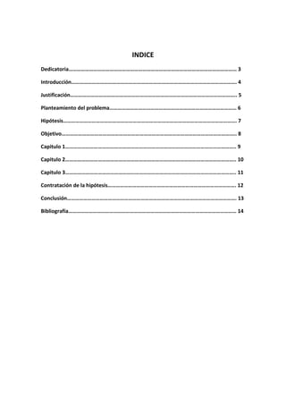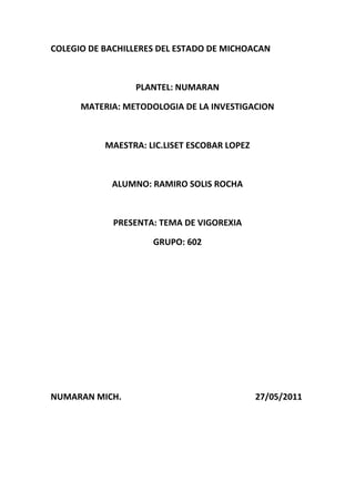 Este documento presenta un tema de investigación sobre la vigorexia. Incluye una introducción en la que se explica que se hablará de los problemas y causas de esta enfermedad psicológica en la que las personas se obsesionan con su cuerpo y toman medicamentos para desarrollar sus músculos causándose daño a sí mismos. Contiene también un índice con los capítulos y secciones que compondrán el trabajo de investigación.