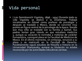 Vigotsky se dedicó a la enseñanza y trabajó como profesor de psicología. Investigó el papel del lenguaje en el desarrollo humano y cómo las palabras evolucionan de significados emocionales a abstractos. Propuso una teoría sociocultural donde los procesos psicológicos superiores se desarrollan a través de la internalización de prácticas sociales, y concibió la Zona de Desarrollo Próximo como la distancia entre lo que alguien puede hacer solo y con ayuda.