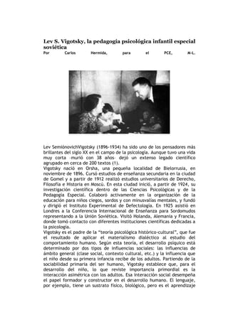 Lev Vigotsky fue un psicólogo soviético del siglo XX que desarrolló la teoría psicológica histórico-cultural. Fundó el Instituto Experimental de Defectología y se centró en la pedagogía para niños con necesidades educativas especiales. Vigotsky argumentó que el desarrollo psicológico está determinado por influencias sociales y la interacción con adultos. También introdujo los conceptos de "zona de desarrollo actual" y "zona de desarrollo próximo".