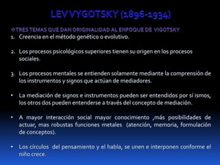 Este documento compara las teorías del desarrollo cognitivo de Piaget y Vygotsky. Ambos psicólogos proponen etapas generales de desarrollo, pero Vygotsky enfatiza más el papel del lenguaje y la educación. También discute implicaciones pedagógicas como usar la zona de desarrollo próximo y andamiaje para ayudar a los estudiantes.