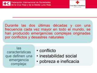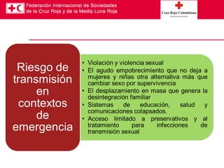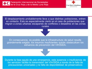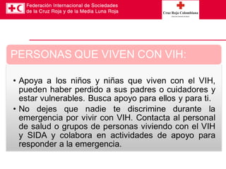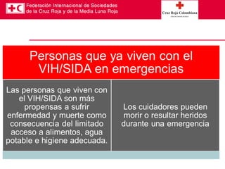 Este documento proporciona recomendaciones para abordar el VIH en contextos de emergencia humanitaria. Explica que se adaptó de la Guía IASC para el direccionamiento del VIH en situaciones humanitarias y del Manual de ONUSIDA sobre prevención del VIH en emergencias, los cuales guían la respuesta al VIH a nivel intersectorial y en cada sector. Define una emergencia y ofrece orientación para la acción frente al VIH en tales contextos.
