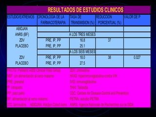 El documento describe la transmisión perinatal del virus de la inmunodeficiencia humana (VIH), incluyendo las tasas de transmisión en diferentes regiones, los factores de riesgo y los momentos clave de transmisión. Explica que la transmisión puede ocurrir durante el embarazo, el parto o la lactancia materna, y destaca la importancia del uso de antirretrovirales para reducir el riesgo de transmisión del VIH de madre a hijo.