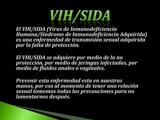 El VIH/SIDA es una enfermedad de transmisión sexual que se adquiere a través de relaciones sexuales sin protección, jeringas infectadas o fluidos corporales, y afecta a todos. Para prevenirla, es importante tomar precauciones como el uso de condones durante las relaciones sexuales para no contraerla ni transmitirla.