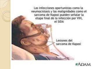 El documento presenta información sobre el VIH/SIDA. Explica que el VIH es un retrovirus que infecta las células del sistema inmune y lo debilita, lo que puede derivar en SIDA. Describe las etapas clínicas del VIH y los síntomas del SIDA. Además, ofrece recomendaciones sobre el cuidado y apoyo a pacientes con VIH/SIDA.