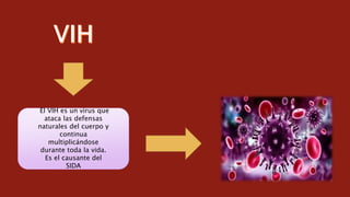 El VIH ataca las defensas naturales del cuerpo y continúa multiplicándose de por vida, causando el SIDA en su etapa avanzada. Se transmite principalmente a través de relaciones sexuales sin protección, contacto con sangre contaminada o de madre a hijo. El tratamiento efectivo consiste en una combinación de tres o más medicamentos antirretrovirales.