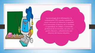 El documento describe cómo las tecnologías de la información y la comunicación (TIC) pueden contribuir a mejorar el acceso universal a la educación, promover la igualdad educativa, mejorar la enseñanza y el aprendizaje, y apoyar el desarrollo profesional de los docentes. También explica cómo la UNESCO promueve el uso de las TIC en la educación a través de estrategias integrales y colaborando con instituciones para desarrollar políticas y actividades relacionadas con las TIC en la educación.