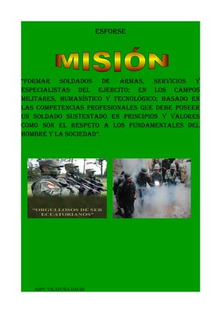 El documento resume la misión del ESFORSE (Escuela Superior de Formación de Oficiales del Ejército) de formar soldados, especialistas y oficiales del ejército en campos militares, humanísticos y tecnológicos basados en competencias profesionales y valores como el respeto a los derechos humanos y la sociedad. Además, busca ser un instituto de formación académico-militar superior, con personal altamente calificado, que fortalezca la gestión del ejército y las fuerzas armadas.