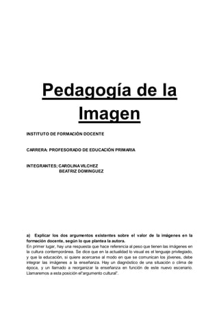 Este documento discute dos argumentos a favor del uso de imágenes en la educación: el "argumento cultural", que sostiene que las imágenes son el lenguaje privilegiado de la cultura contemporánea, y el "argumento didáctico", que considera que las imágenes pueden motivar e interesar a los estudiantes. Sin embargo, también señala limitaciones de ambos enfoques, como que pueden relegar a las imágenes a un rol secundario o no captar su complejidad. El desafío es trabajar con "regímenes de visualidad"