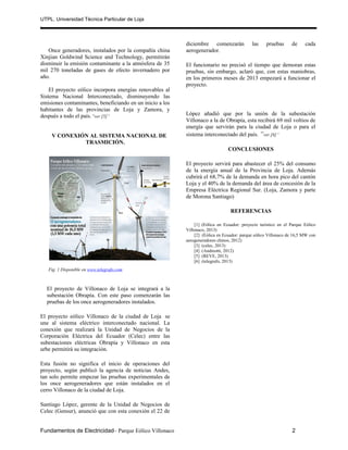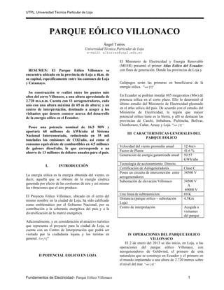 El documento describe el Parque Eólico Villonaco ubicado en Loja, Ecuador. Cuenta con 11 aerogeneradores con una altura máxima de 65 metros ubicados a una altura de 2,720 metros sobre el nivel del mar. El parque tiene una potencia nominal de 16.5 MW y abastecerá el 25% del consumo anual de energía de la provincia de Loja, reduciendo las emisiones de CO2 en 35,000 toneladas por año.
