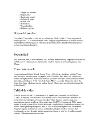 Vimeo es un sitio web lanzado en 2004 que permite a los usuarios compartir y almacenar videos digitales. Los usuarios deben registrarse para subir videos, crear perfiles y comentar. Vimeo ofrece la opción de videos de alta definición y un servicio de pago llamado Vimeo Plus que permite la carga de más videos y contenido en alta definición sin límite.