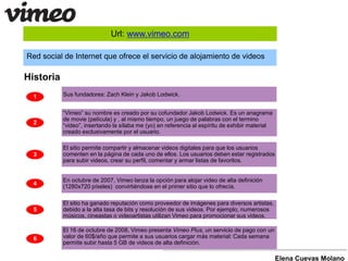 Vimeo es una red social que permite a los usuarios compartir y almacenar videos digitales. Fue fundada por Zach Klein y Jakob Lodwick y ofrece servicios como crear un perfil, subir y compartir videos, organizar contenido y buscar videos de otros usuarios. Vimeo se ha ganado una reputación como plataforma para artistas debido a su alta calidad de video.