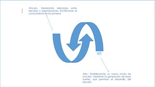 Este documento presenta la información sobre una organización llamada Vincularte, cuyo objetivo principal es contribuir al mejoramiento de la calidad de vida y el fortalecimiento de las competencias de los estudiantes de nivel superior a través de su vinculación e integración a la aplicación práctica en empresas, promoviendo su desarrollo profesional. Vincularte busca ofrecer una oportunidad de experiencia profesional y capacitación a través de simulaciones que permitan a los estudiantes adaptarse al entorno laboral antes de realizar práctic