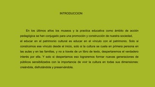 El documento describe los vínculos entre los programas educativos oficiales y los contenidos de los museos, y cómo estos favorecen a los docentes. Explica que los museos son espacios educativos importantes que ofrecen experiencias únicas para los estudiantes y complementan el aprendizaje en el aula. Asimismo, señala que los museos se están posicionando como herramientas de aprendizaje formal para los docentes, a través de visitas guiadas, talleres y otras actividades educativas.