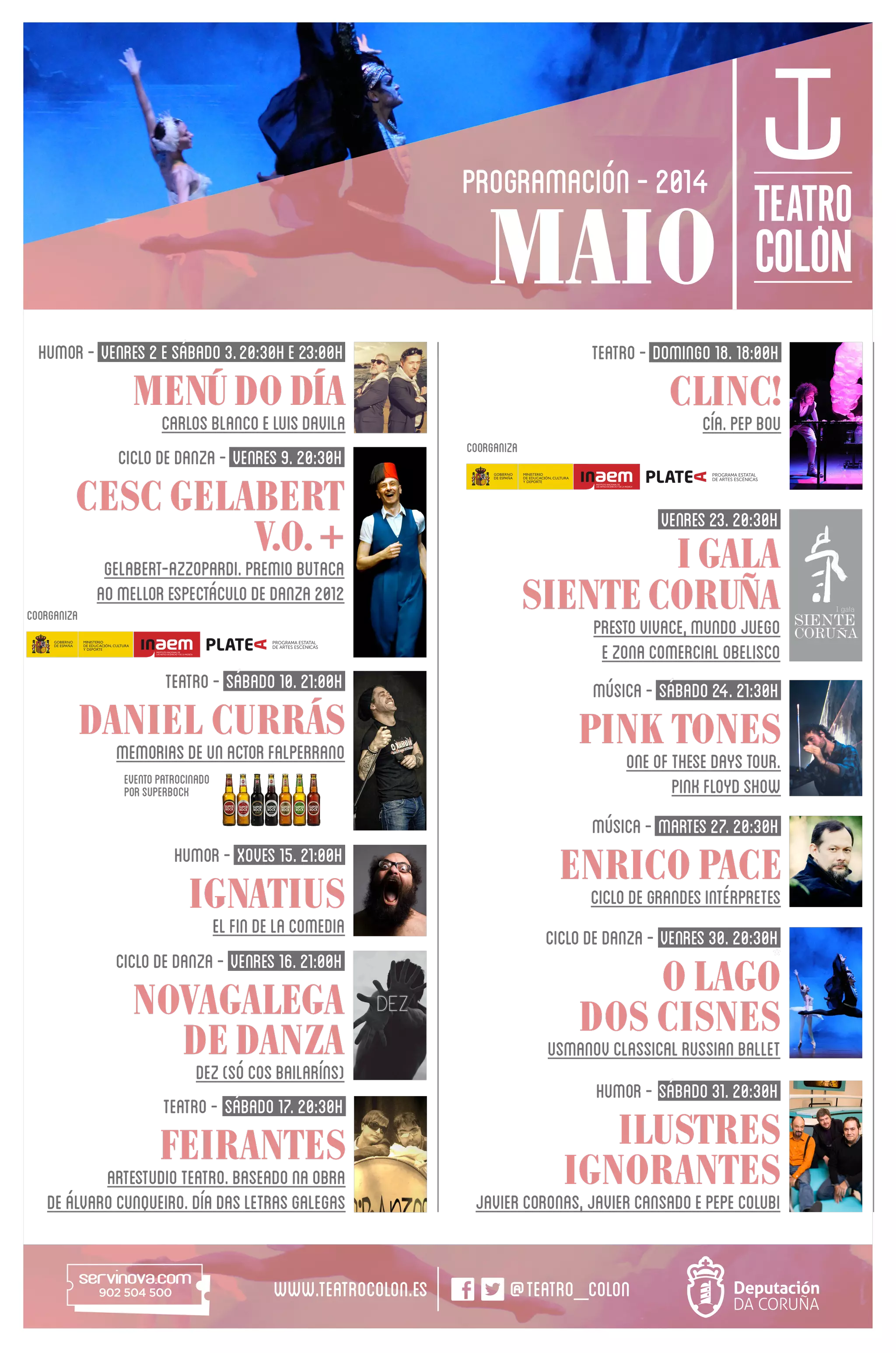El documento presenta la programación de eventos culturales para el mes de mayo en el teatro MAIO. Incluye obras de teatro, conciertos de música, espectáculos de danza e humor. Destaca las presentaciones de las obras "El fin de la comedia" y "Feirantes", los espectáculos de danza de Cesc Gelabert, Nova Galega de Danza y el Lago de los Cisnes, y los espectáculos de humor de Carlos Blanco, Luis Davila e Ignatius.