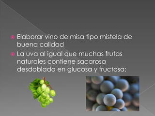 El documento describe el proceso para elaborar un vino de misa de buena calidad a partir de uvas maduras y sanas. Se extrae el jugo de las uvas y se filtra, luego se le agregan uvas pasas, levadura y azúcar. La mezcla se guarda por 1 mes y luego puede blanquearse con clara de huevo y pasteurizarse a 70°C para eliminar metanol. Después de 3 meses de almacenamiento, el vino estará listo para su consumo y se evaluarán sus propiedades como color, sabor y olor.