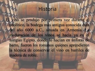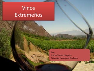 Este documento trata sobre los vinos de Extremadura. Brevemente describe la historia del vino y su proceso de elaboración, señalando que la fermentación es la parte principal de este proceso. Además, destaca algunas de las principales bodegas extremeñas y los tipos de vino según su color y periodo de maduración. Por último, analiza aspectos como las exportaciones, el consumo y la producción de vino en Extremadura.
