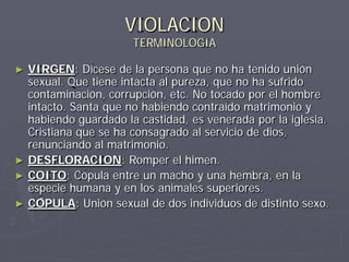 Este documento presenta la terminología, bases legales y aspectos anatómicos relacionados con el delito de violación en Venezuela. Define términos como virgen, desfloración y cópula, y resume las leyes venezolanas como el Código Penal, la Ley contra la Violencia hacia la Mujer y la Ley de Protección del Niño y Adolescente que penalizan diferentes formas de violación. También incluye información sobre los tipos de himen y exámenes requeridos para las víctimas de este delito.