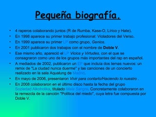 Violadores del Verso es un grupo de rap español formado en 1998 por cuatro raperos: R de Rumba, Kase-O, Lírico y Hate. Han publicado varios álbumes como Violadores del Verso (1998), Genios (1999), Vicios y Virtudes (2001) y Vivir para contarlo/Haciendo lo nuestro (2006), los cuales les han valido varios discos de oro. Sus conciertos atraen entre 5,000 y 15,000 personas y han girado por España y América. Son considerados uno de los grupos más