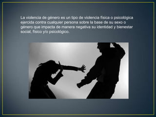 La violencia de género incluye violencia física y psicológica ejercida contra personas sobre la base de su sexo o género, como asaltos, violaciones, explotación laboral, aborto selectivo, violencia contra prostitutas, tráfico de personas y ataques homofóbicos. Puede incluir violencia física mediante golpes u objetos, violencia psicológica a través de insultos e intimidación, y violencia sexual a través de la coacción para mantener relaciones no deseadas. Aunque generalmente se asocia