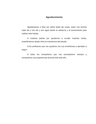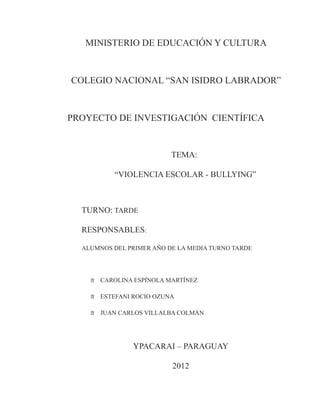Este documento describe un proyecto de investigación sobre el bullying en las escuelas realizado por tres estudiantes de secundaria. El objetivo del proyecto es conocer las causas del bullying, sus efectos en las víctimas y victimarios, y el comportamiento de los profesores ante este problema. El documento incluye la introducción, descripción del problema, hipótesis, justificación, objetivos, preguntas de investigación, marco histórico, conceptual y teórico.