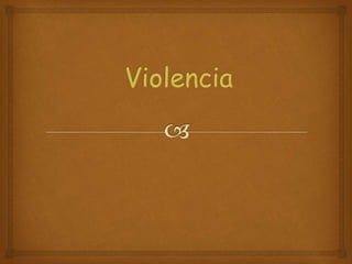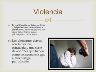 El documento describe los diferentes tipos de violencia, incluyendo la autoinfligida, interpersonal, colectiva, física, psicológica, sexual, económica, patrimonial, social, cultural, religiosa, ciberacoso, vicaria y por negligencia. También analiza la violencia en el contexto familiar e intrafamiliar y de género. Los factores que propician la violencia incluyen factores biológicos, ambientales, educación y medios de comunicación.
