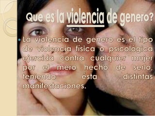 El documento define la violencia de género como cualquier acto de violencia basado en el género que cause daño físico, sexual o psicológico a una persona, incluyendo amenazas, coerción o privación de libertad, ya sea en la vida pública o privada. Menciona que las mujeres sufren daños específicos a su género como la mutilación genital femenina o la violencia doméstica con más frecuencia que los hombres. También explica que se han implementado diversas iniciativas y políticas en las últimas décadas