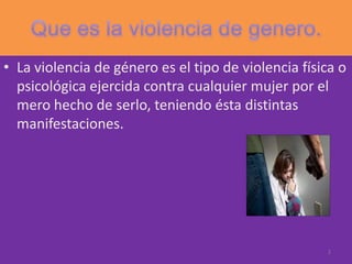 La violencia de género se refiere a la violencia física o psicológica ejercida contra las mujeres por el hecho de serlo. Aunque no toda la violencia contra las mujeres constituye violencia de género, esta se basa en las relaciones de género dominantes en una sociedad. El maltrato a las mujeres es uno de los actos violentos más frecuentes y a menudo ocurre en silencio debido al miedo o vergüenza de las víctimas. La conclusión es que cuando alguien sufre violencia debe pedir ayuda
