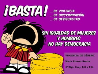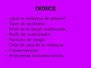 La violencia de género, definida como cualquier acto de violencia hacia mujeres basado en su sexo, se manifiesta en formas físicas, psicológicas y sexuales, afectando profundamente sus derechos y bienestar. Existen perfiles tanto de víctimas como de maltratadores, donde factores culturales, económicos y legales juegan un papel importante en el ciclo de la violencia. Las consecuencias abarcan problemas psicológicos, sexuales y físicos, destacando la necesidad de intervención y educación para prevenir y abordar este grave problema social.