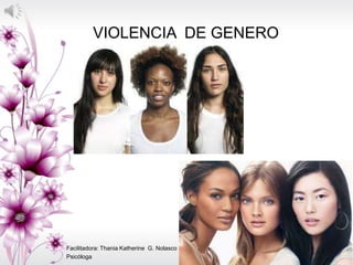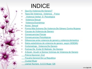 Este documento trata sobre la violencia de género y contiene información sobre sus diferentes tipos (física, verbal, sexual, económica), causas, consecuencias, datos estadísticos, y a quién acudir para obtener ayuda. También incluye un cortometraje sobre este tema y formas de prevenir la violencia de género.
