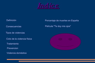 El documento trata sobre la violencia de género. Explica que la violencia de género se ejerce hacia las mujeres por el hecho de serlo e incluye malos tratos de pareja y agresiones físicas o sexuales. Describe los tipos de violencia como física, psicológica, económica, social y sexual. También habla sobre las consecuencias psicológicas para la mujer maltratada y el ciclo de la violencia física. Finalmente, ofrece recomendaciones sobre el tratamiento y la prevención de