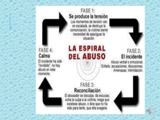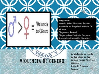 Este documento presenta un resumen de la violencia de género. Identifica a los integrantes del proyecto y define la violencia de género como aquella ejercida contra una persona sobre la base de su sexo o género. Describe las características típicas de un agresor y los tipos principales de violencia: psicológica, física, económica y sexual.